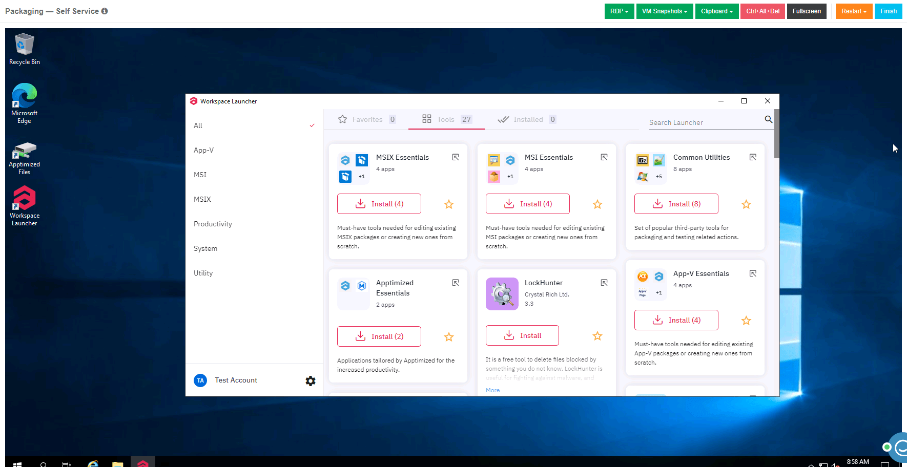 Dozens of Apptimized-developed tools accompanied by well-known 3rd party tools are provided by Workspace Launcher for instant availability in your packaging environment. Best-practice bundles of packaging tools support for you to create MSI, App-V, MSIX, and IntuneWin and edit application packages in the most common formats.